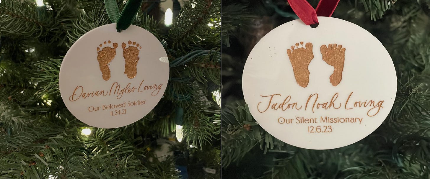 That year, one of the most meaningful gifts we received came from dear friends in Nebraska. They sent us three ornaments, each engraved with our sons’ footprints and names. When I opened the package, I wept. Just weeks earlier, we had said goodbye to Jadon, and our home still felt unbearably quiet. But holding those ornaments, I felt something shift.